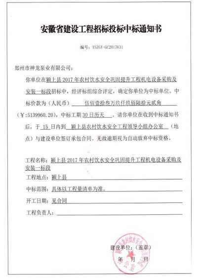 祝贺我司在安徽省农村饮水工程中标513万余元